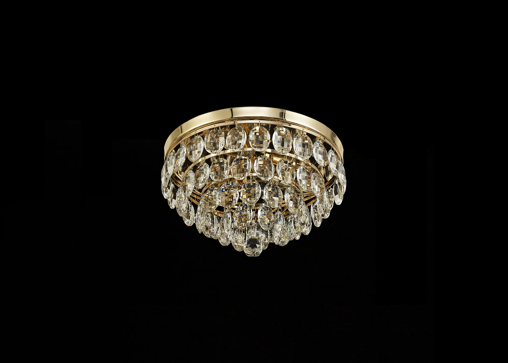 Senorita is a flush crystal ceiling 3 light in french gold which has a cascade of wonderful crystal.