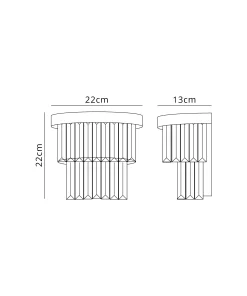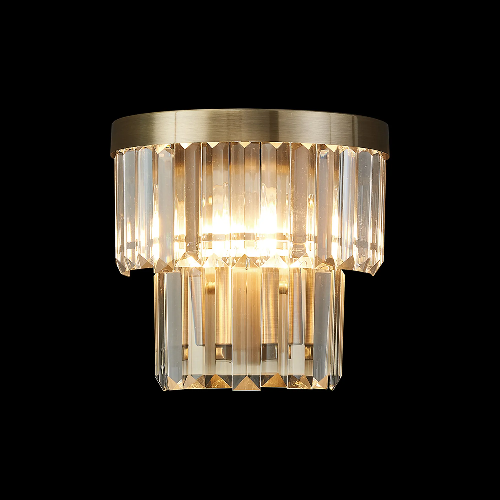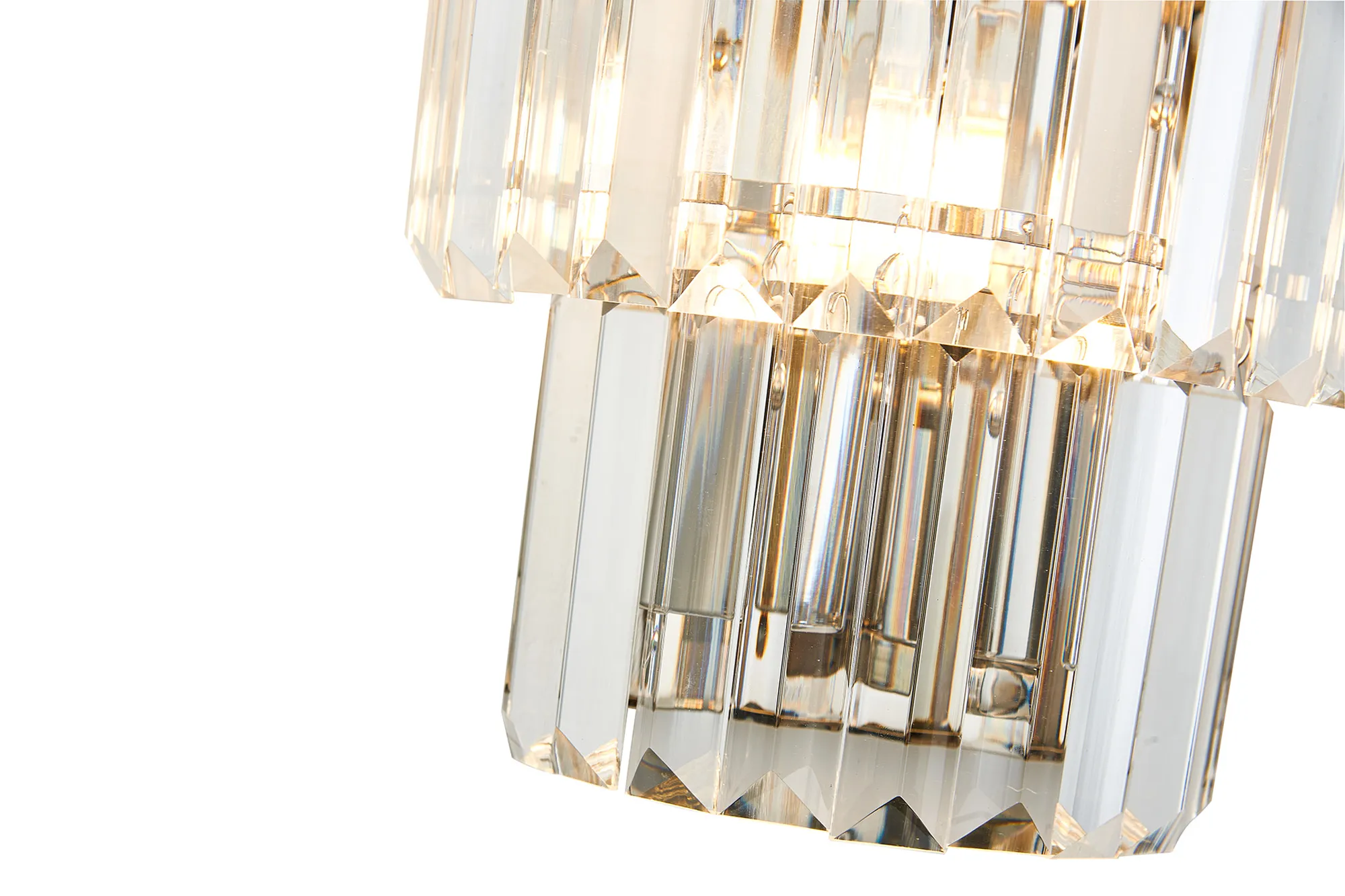Dazzling substantial crystal pieces adorn EVI wall light polished nickel and antique brass frames. The pendant, ceiling and wall lights create a tiered effect with the rectangular clear crystals. This creates a stunning effect when not in use or when illuminated by the 2 x E14 lampholders. lamps are not included.