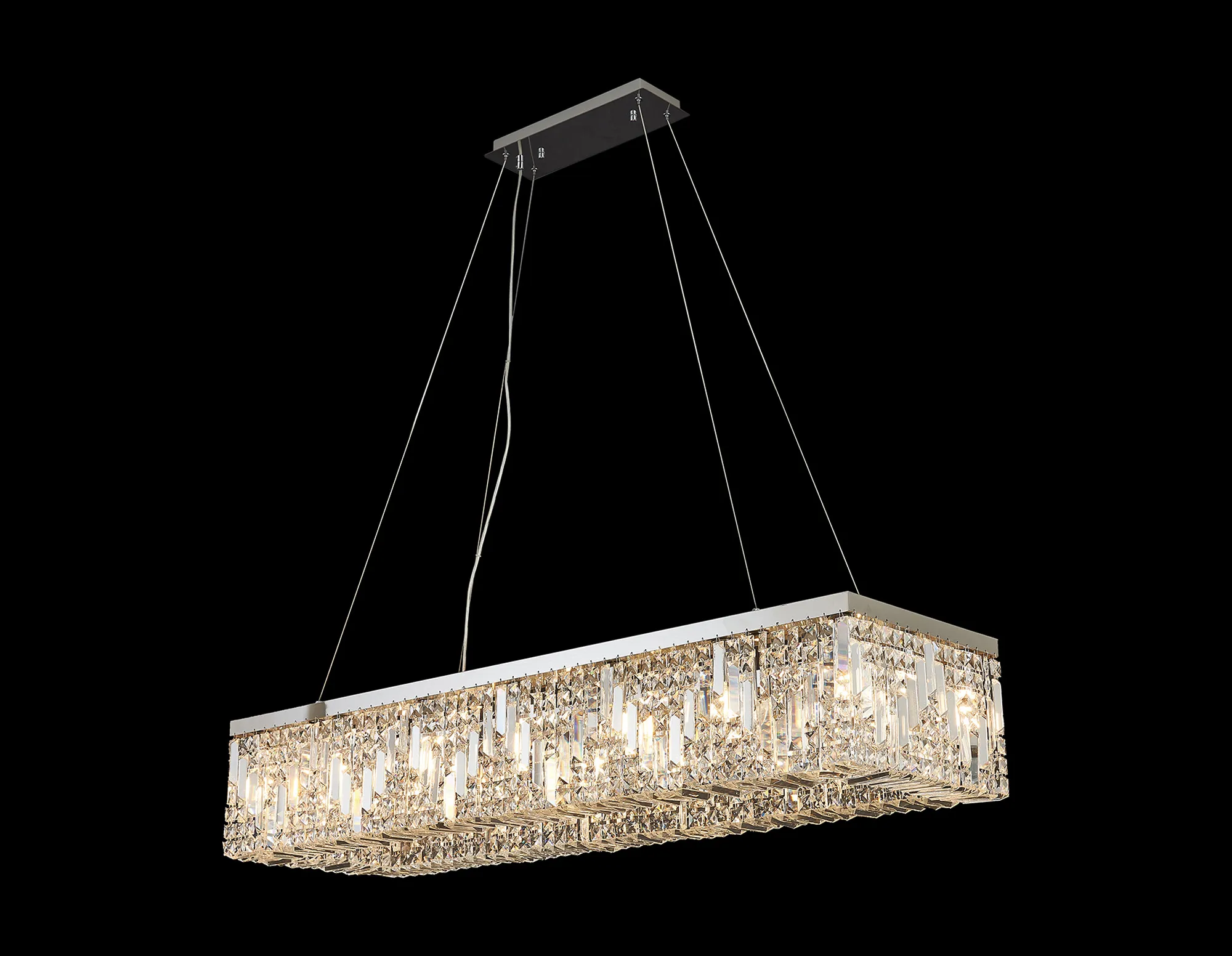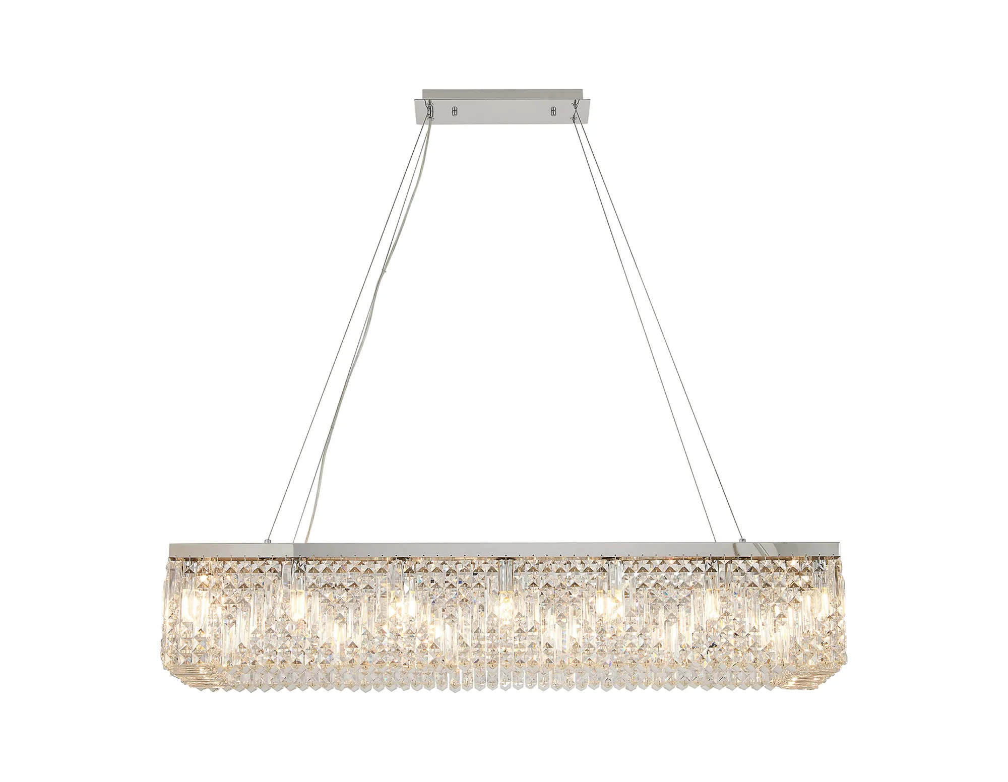 KATTY is a prestigious collection of alluring crystal fixtures that enraptures its audience with the exceptional dazzling quality of each piece of clear crystal. From 1m rectangular pendants to 45cm round flush lights each impressive design is available in either a polished chrome or gold finish. The striking strands of crystal hang either side of the E14 lamp holders and are joined beneath them with additional rectangular crystal pieces, to conceal the lamps used and heighten the sparkle demonstrated when illuminated.
