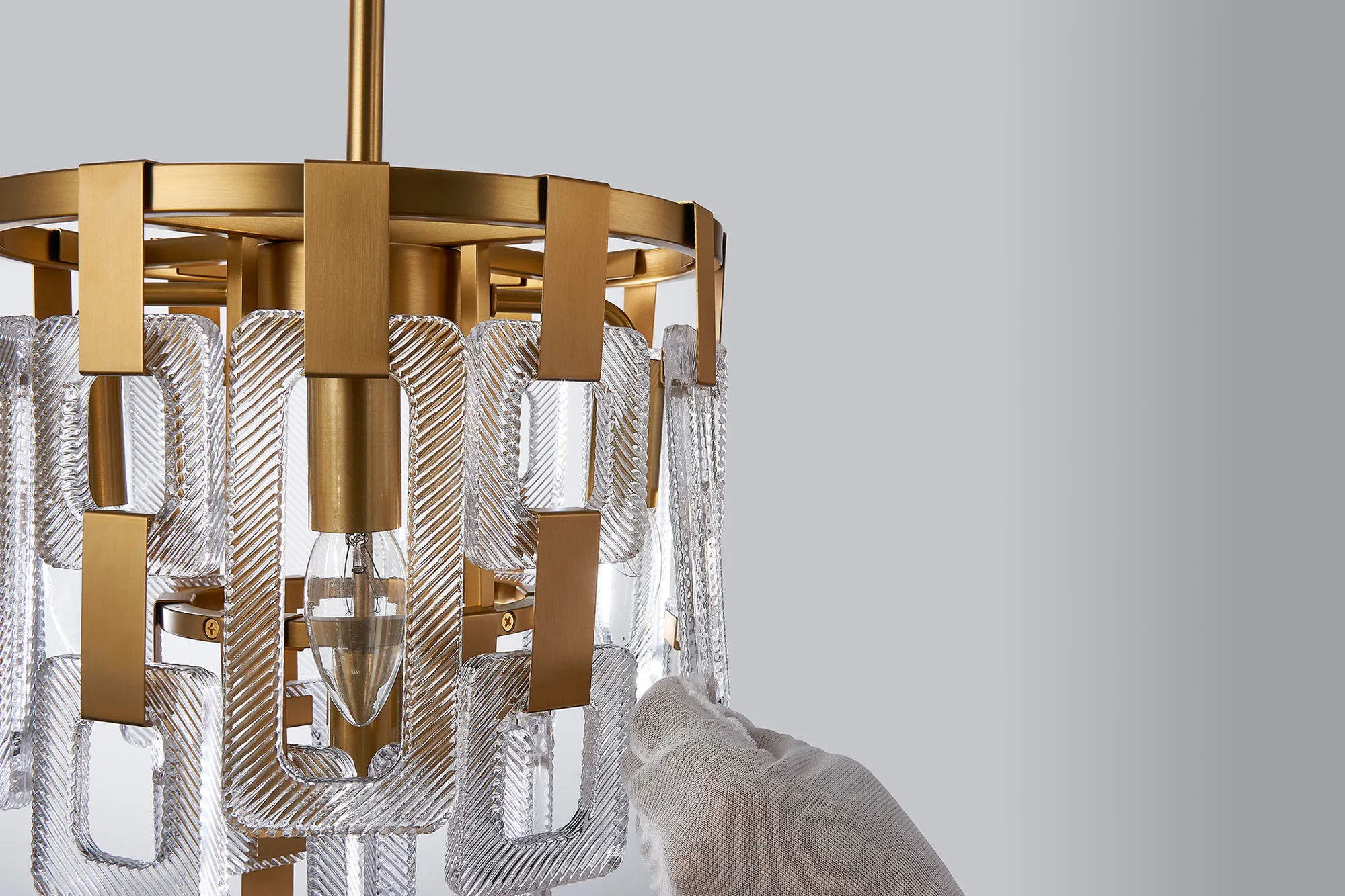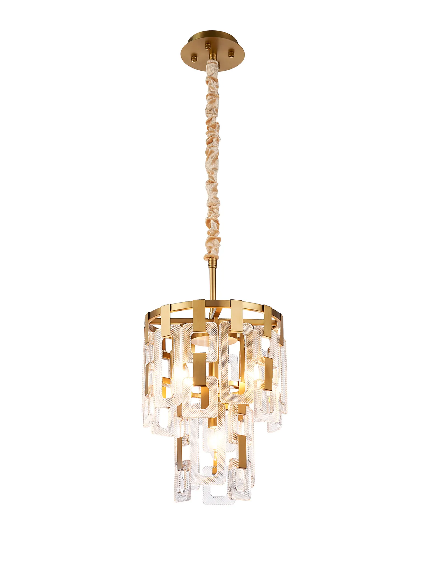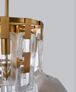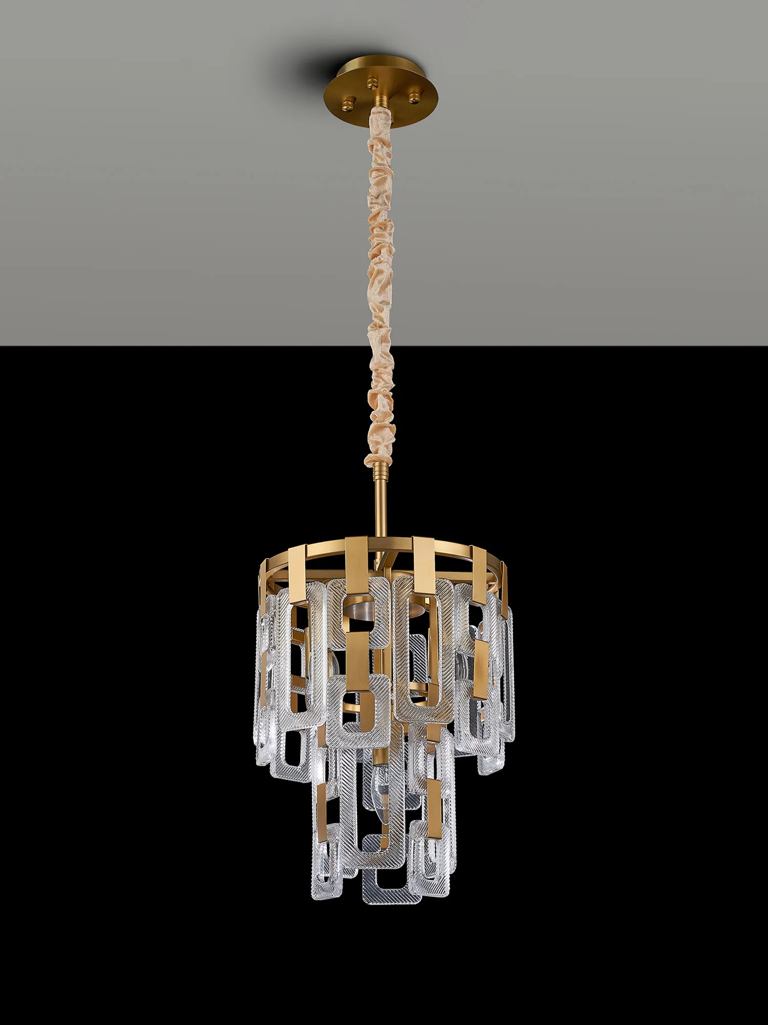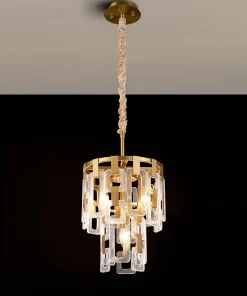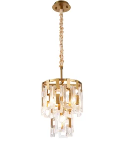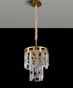 The Roman range is a striking fusion of artistry and light in either satin gold or satin nickel Crafted from a composite of square and rectangular clear glass pieces, each pendant creates a mesmerising visual reminiscent of elegant chain mail. The staggered arrangement of glass forms captures and reflects light beautifully, delivering a dazzling play of brilliance and shadow.