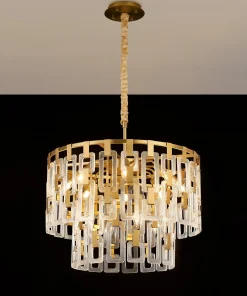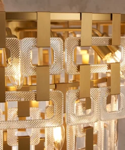 The Roman range is a striking fusion of artistry and light in either satin gold or satin nickel Crafted from a composite of square and rectangular clear glass pieces, each pendant creates a mesmerising visual reminiscent of elegant chain mail. The staggered arrangement of glass forms captures and reflects light beautifully, delivering a dazzling play of brilliance and shadow.