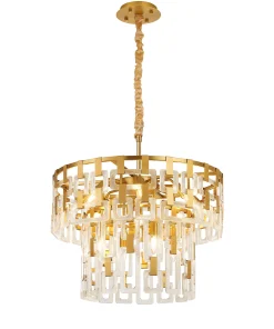 The Roman range is a striking fusion of artistry and light in either satin gold or satin nickel Crafted from a composite of square and rectangular clear glass pieces, each pendant creates a mesmerising visual reminiscent of elegant chain mail. The staggered arrangement of glass forms captures and reflects light beautifully, delivering a dazzling play of brilliance and shadow.
