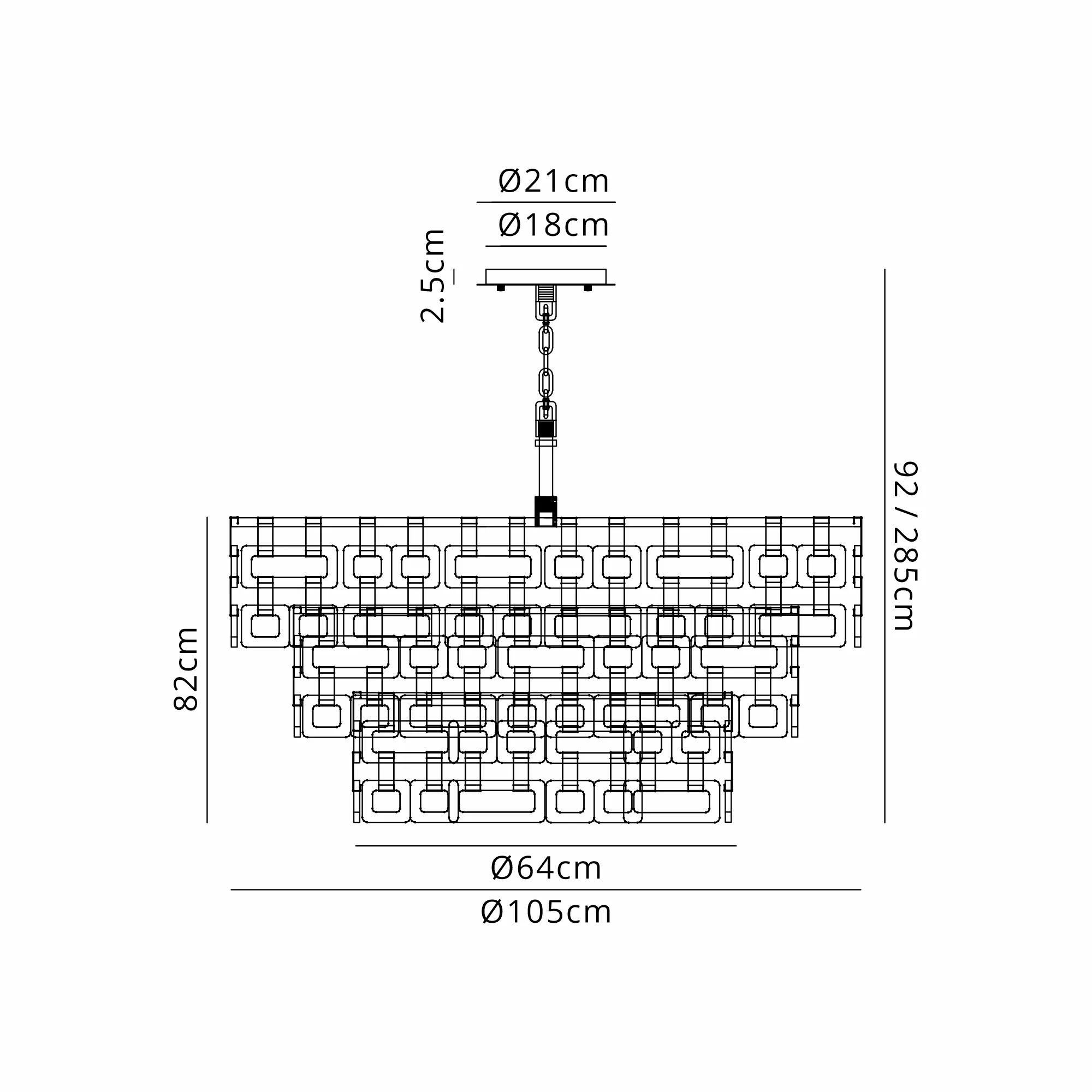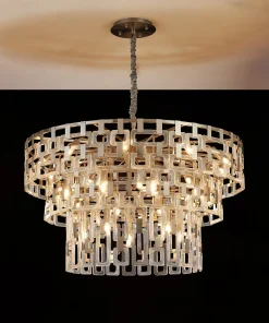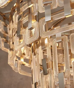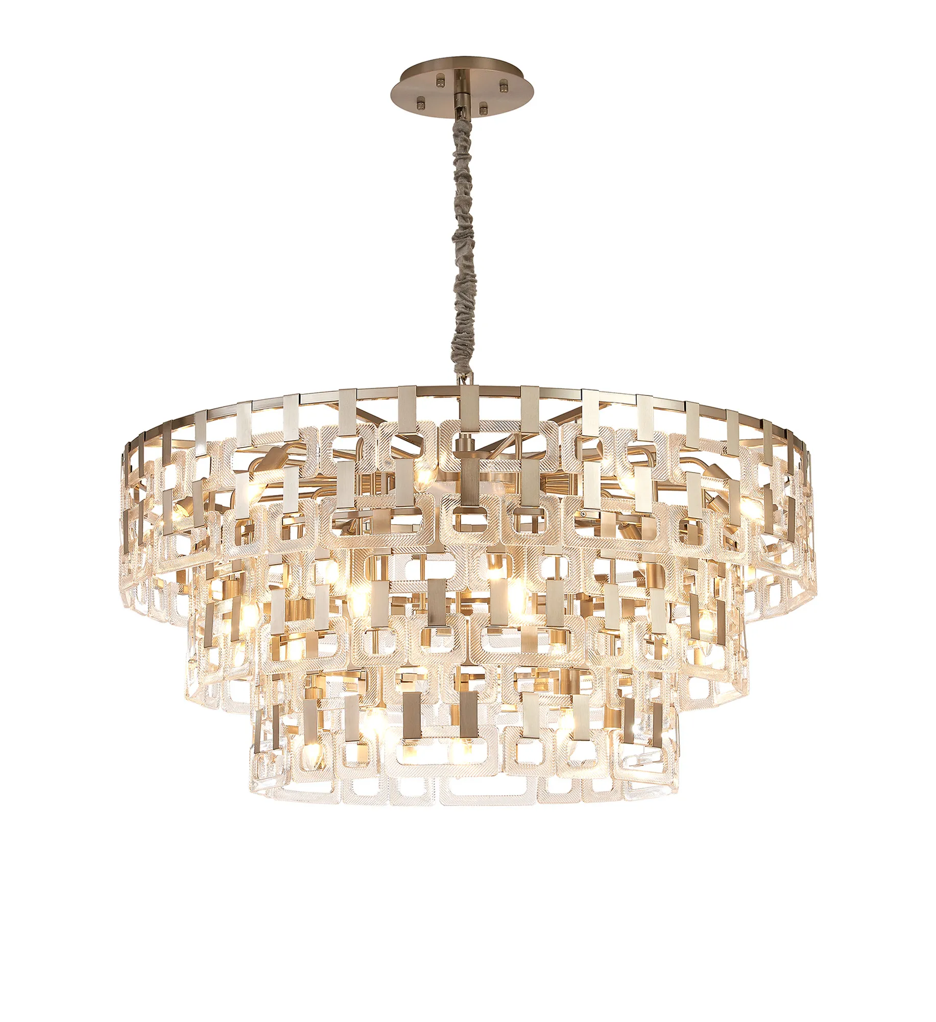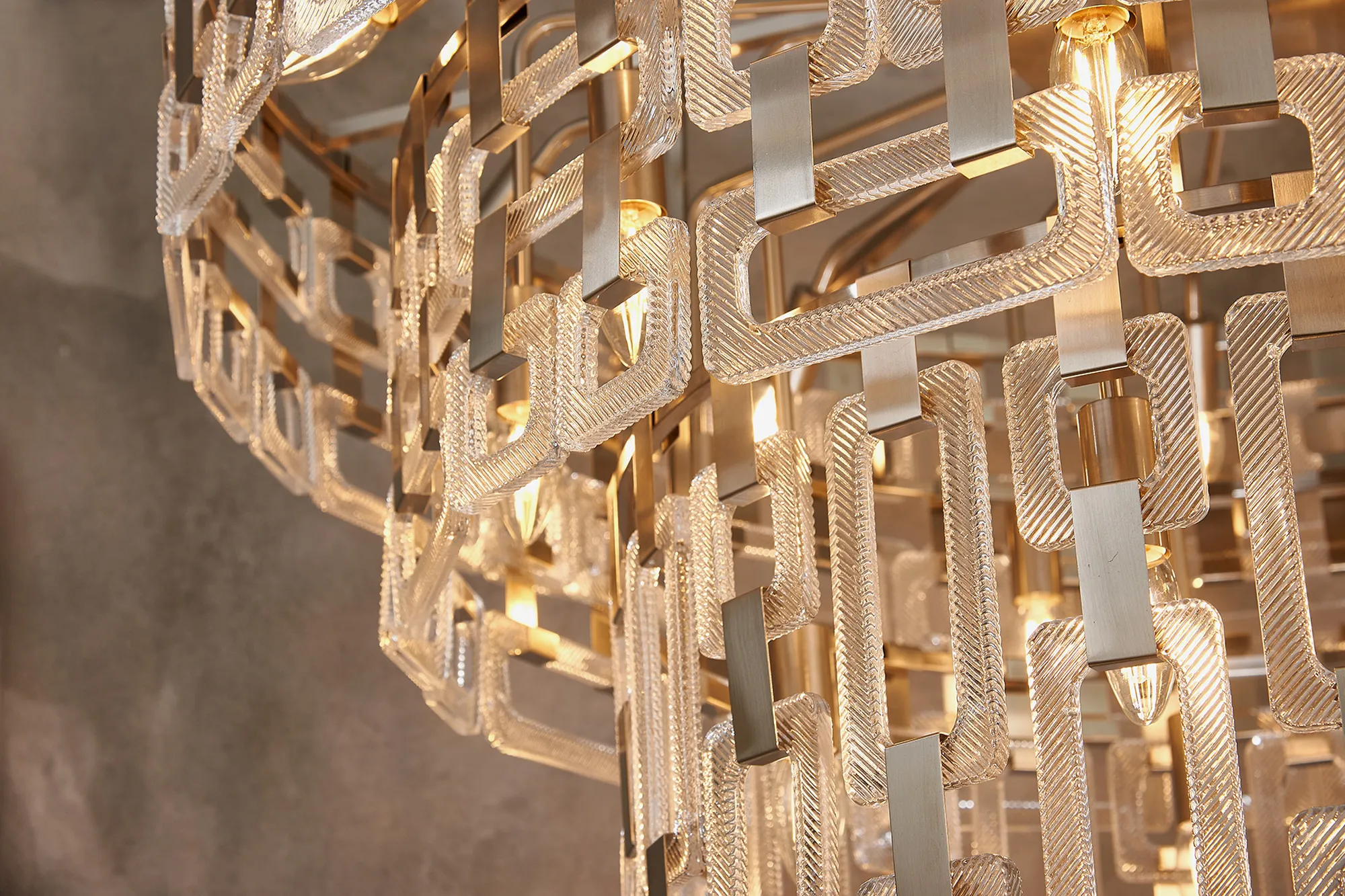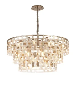 The Roman range is a striking fusion of artistry and light in either satin gold or satin nickel Crafted from a composite of square and rectangular clear glass pieces, each pendant creates a mesmerising visual reminiscent of elegant chain mail. The staggered arrangement of glass forms captures and reflects light beautifully, delivering a dazzling play of brilliance and shadow.