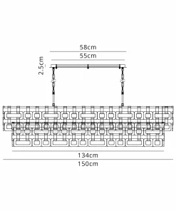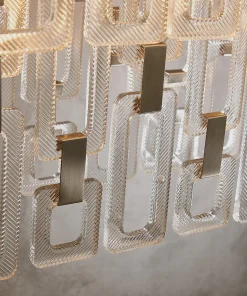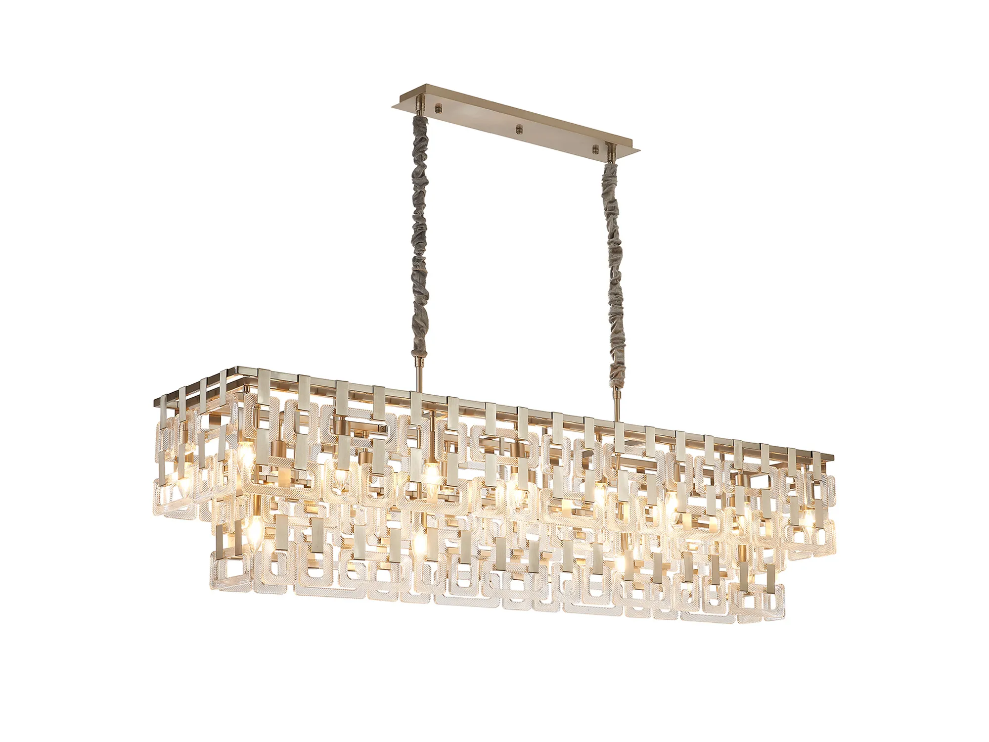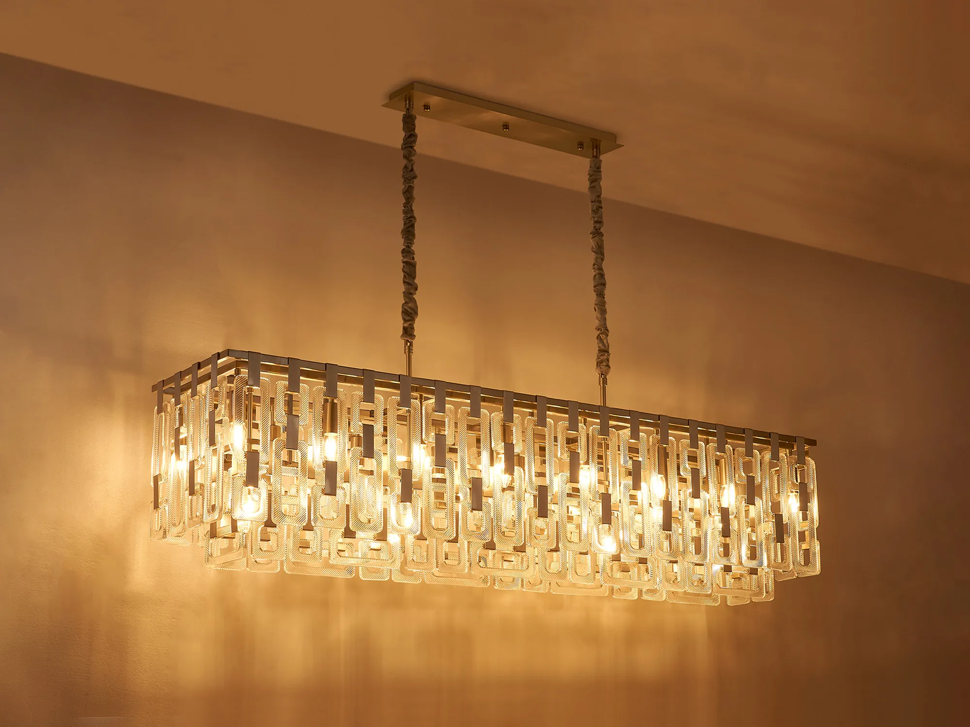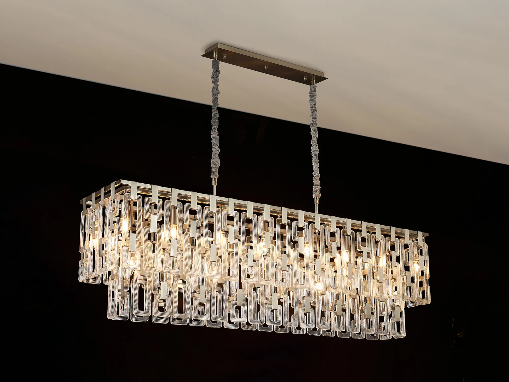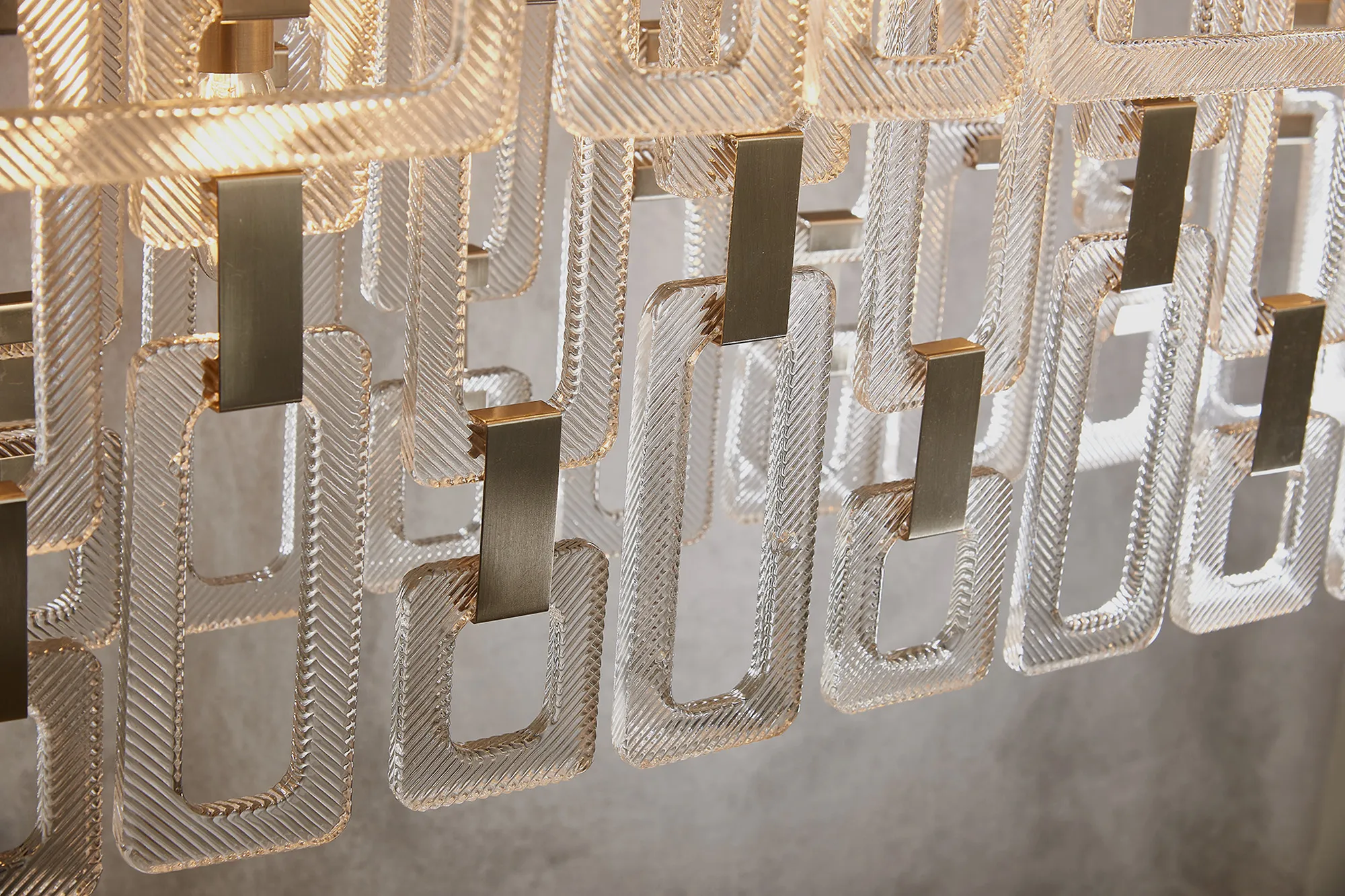 The Roman range is a striking fusion of artistry and light in either satin gold or satin nickel Crafted from a composite of square and rectangular clear glass pieces, each pendant creates a mesmerising visual reminiscent of elegant chain mail. The staggered arrangement of glass forms captures and reflects light beautifully, delivering a dazzling play of brilliance and shadow.
