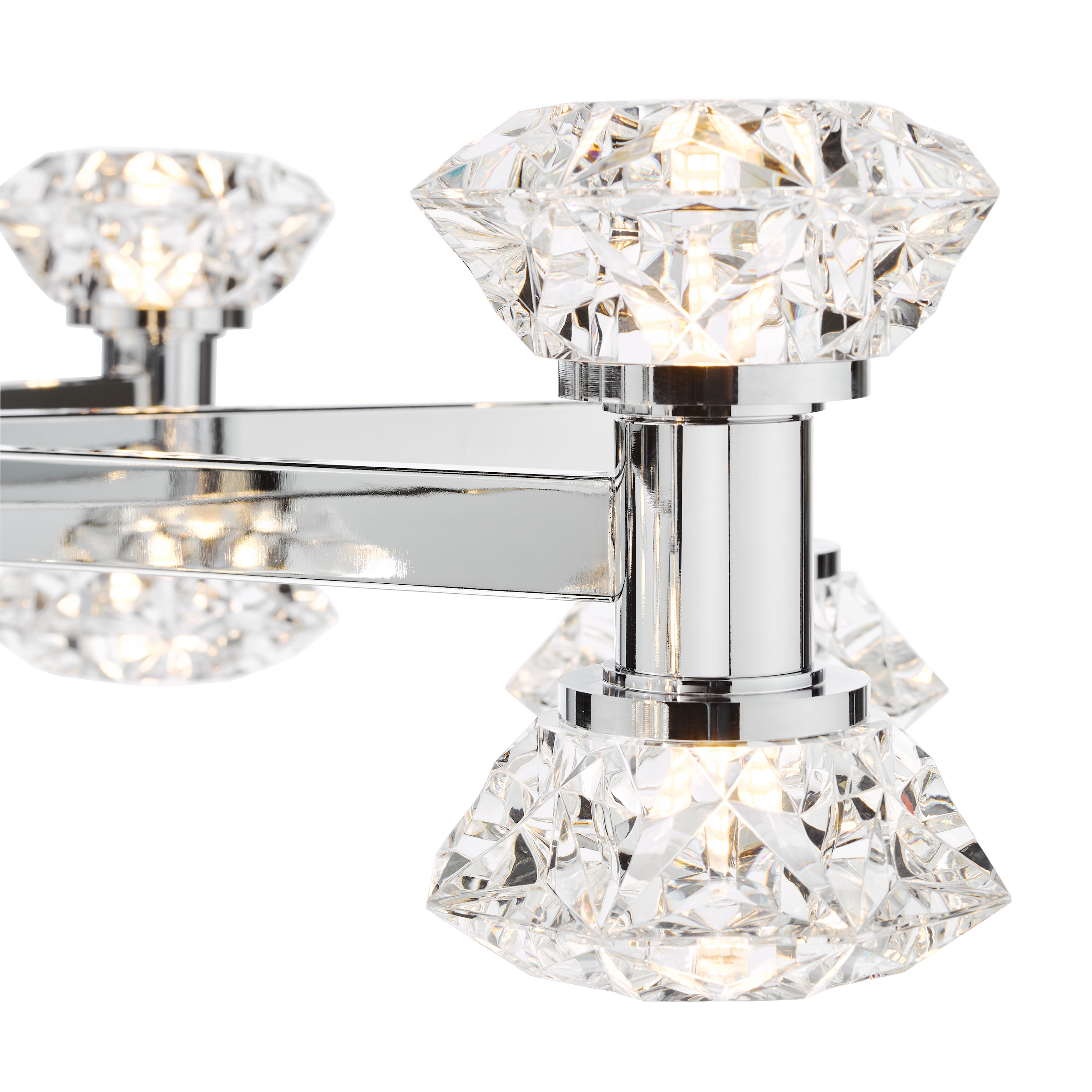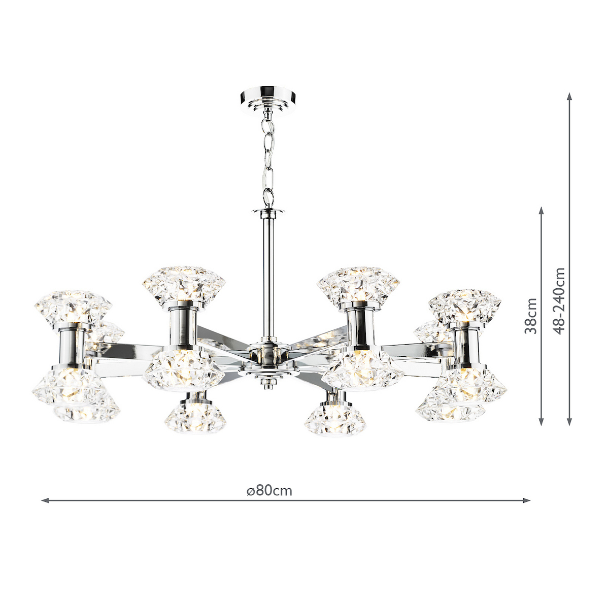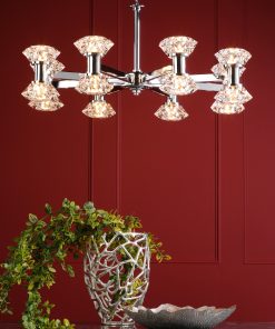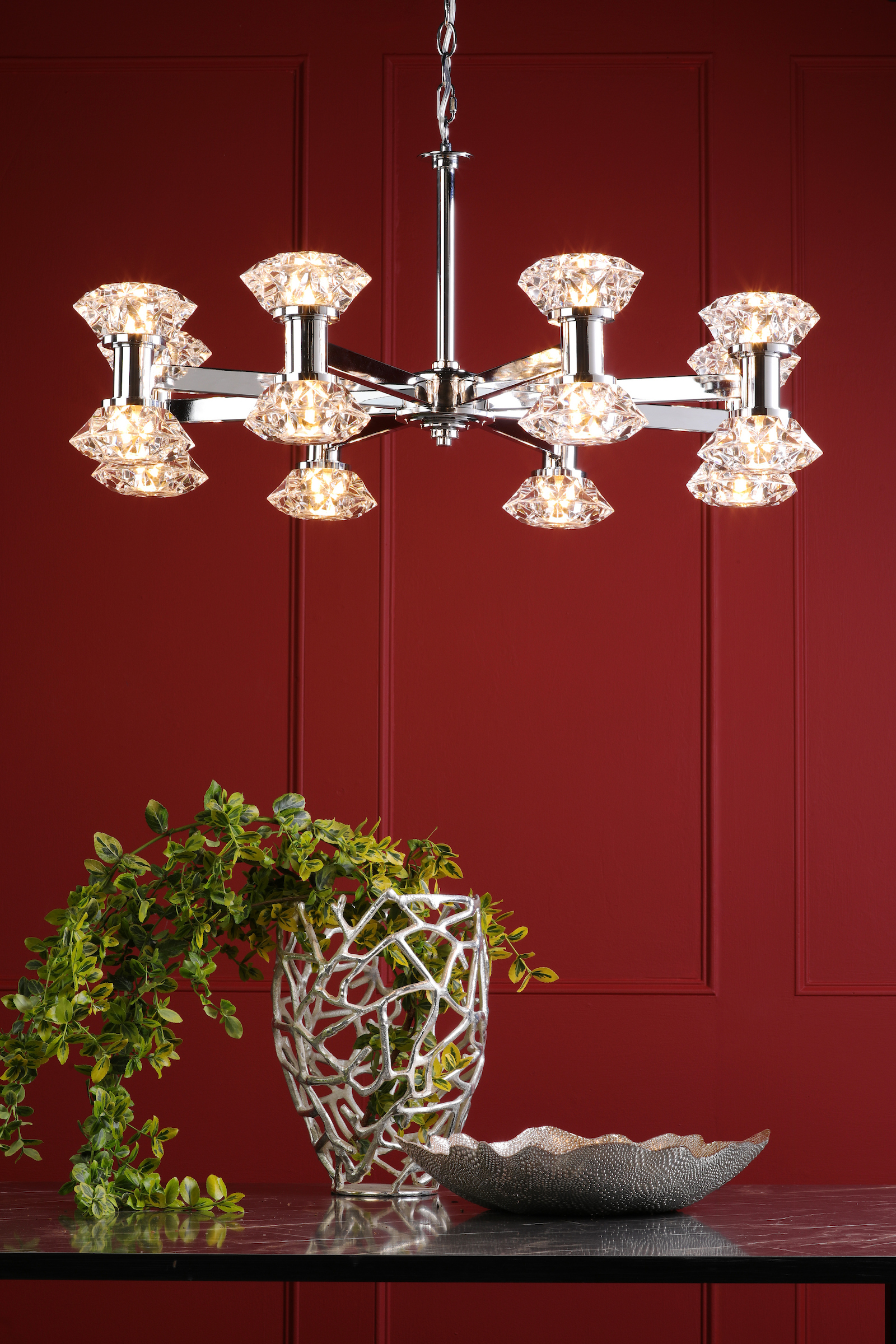 Elevate your space with this dazzling 16 Light Armed Pendant combines polished chrome and clear crystal-effect shades for a truly show-stopping effect. With its generous array of 16 light arms, this pendant promises to bathe your room in a warm, inviting glow. The oversized crystal-effect shades add a touch of drama, creating a captivating interplay of light and shadow. Perfect for those who aren’t afraid to make a statement, this pendant light effortlessly blends modern aesthetics with timeless elegance. And for those who love a coordinated look, there’s a matching wall light available. Whether illuminating a grand entryway or serving as the centerpiece of your dining room.