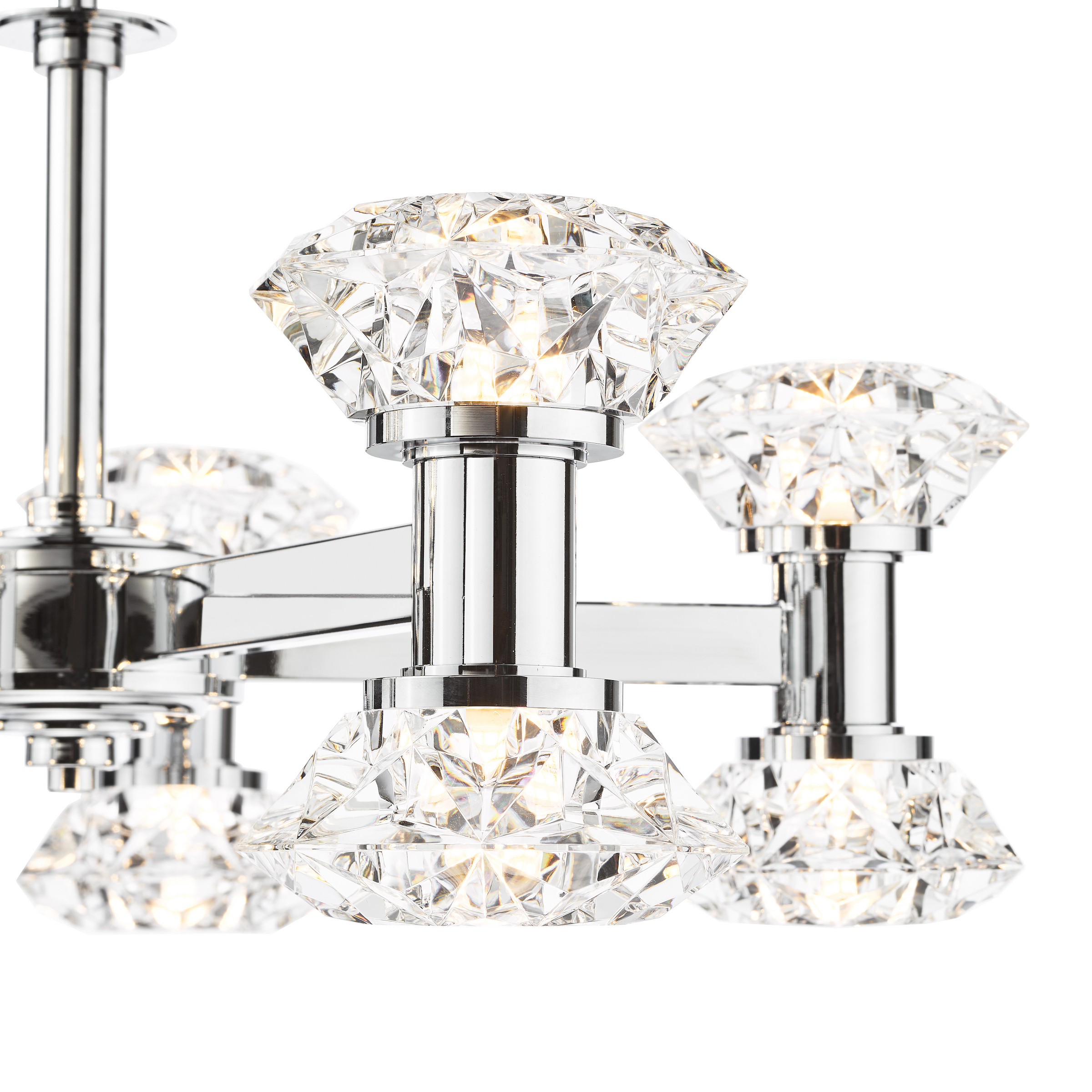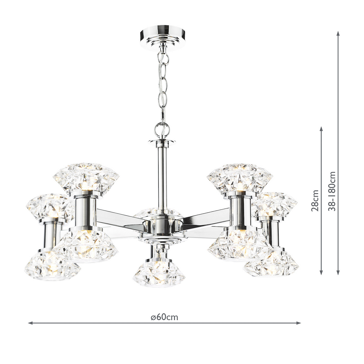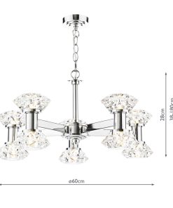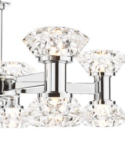 Elevate your space with this dazzling 10 Light Armed Pendant combines polished chrome and clear crystal-effect shades for a truly show-stopping effect. With its generous array of 16 light arms, this pendant promises to bathe your room in a warm, inviting glow. The oversized crystal-effect shades add a touch of drama, creating a captivating interplay of light and shadow. Perfect for those who aren’t afraid to make a statement, this pendant light effortlessly blends modern aesthetics with timeless elegance. And for those who love a coordinated look, there’s a matching wall light available. Whether illuminating a grand entryway or serving as the centerpiece of your dining room.