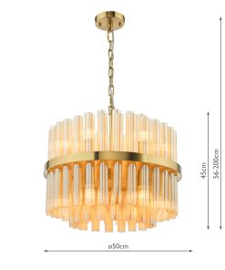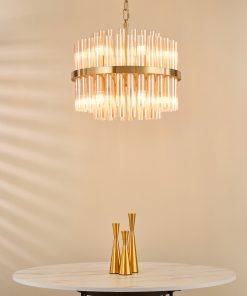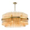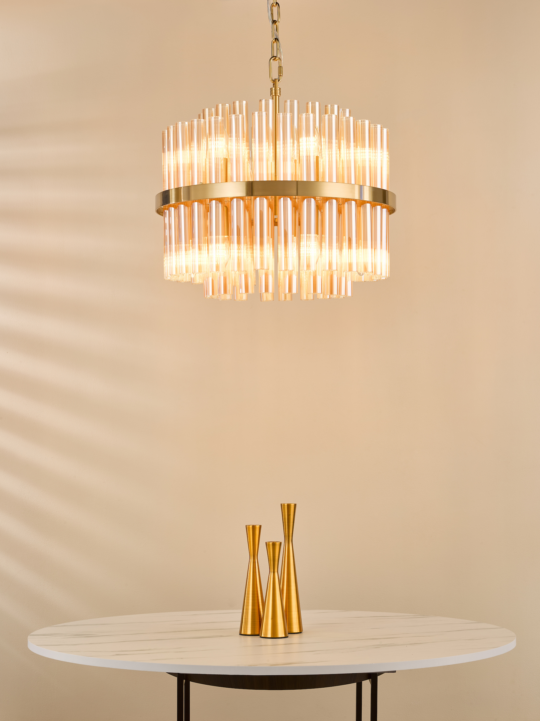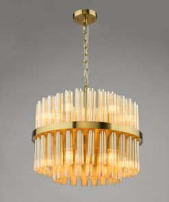 12 LIGHT CLEAR GLASS WITH LARGE GLASS RODS AND A GOLD FRAME.