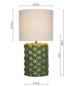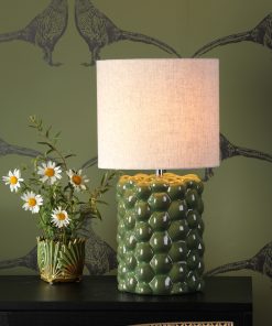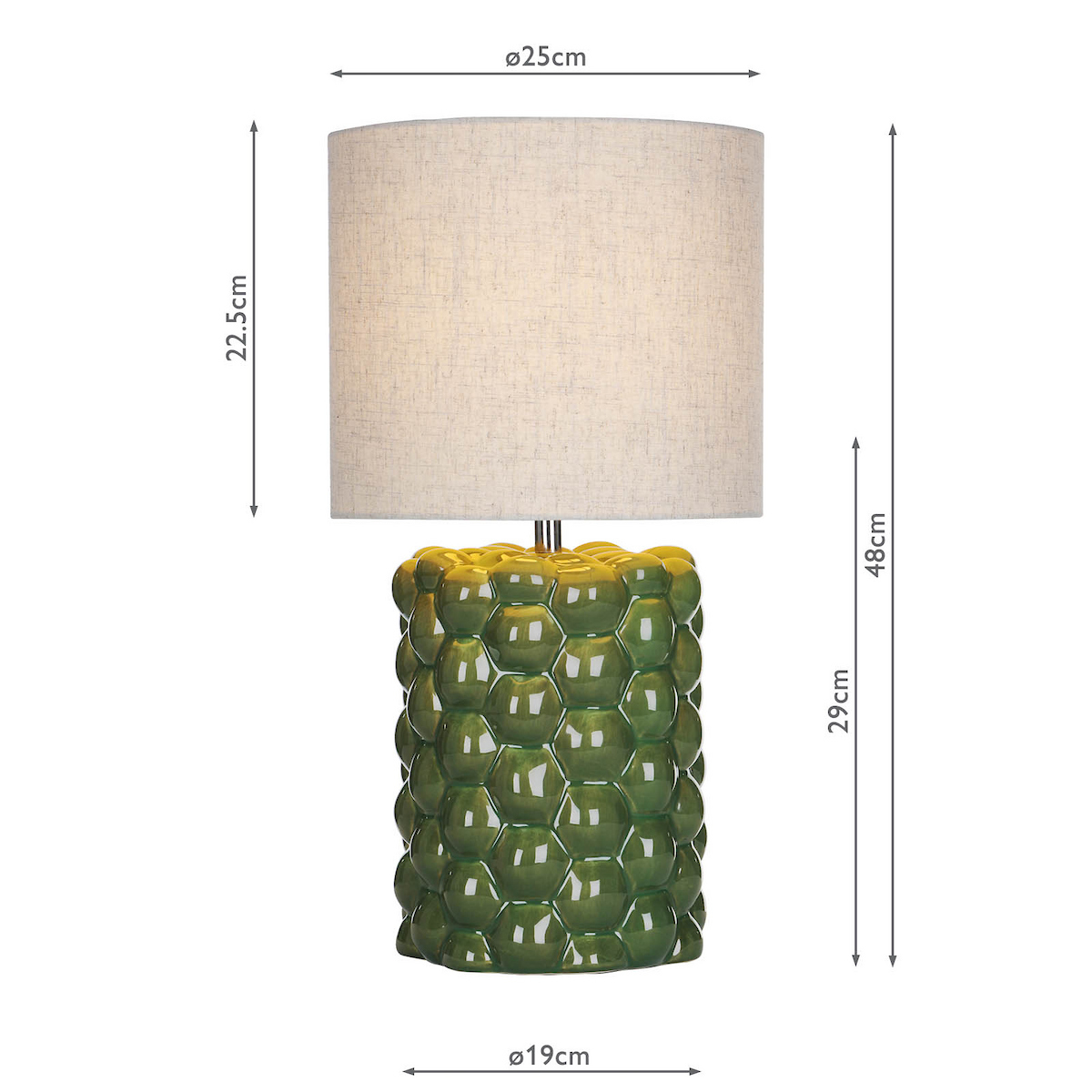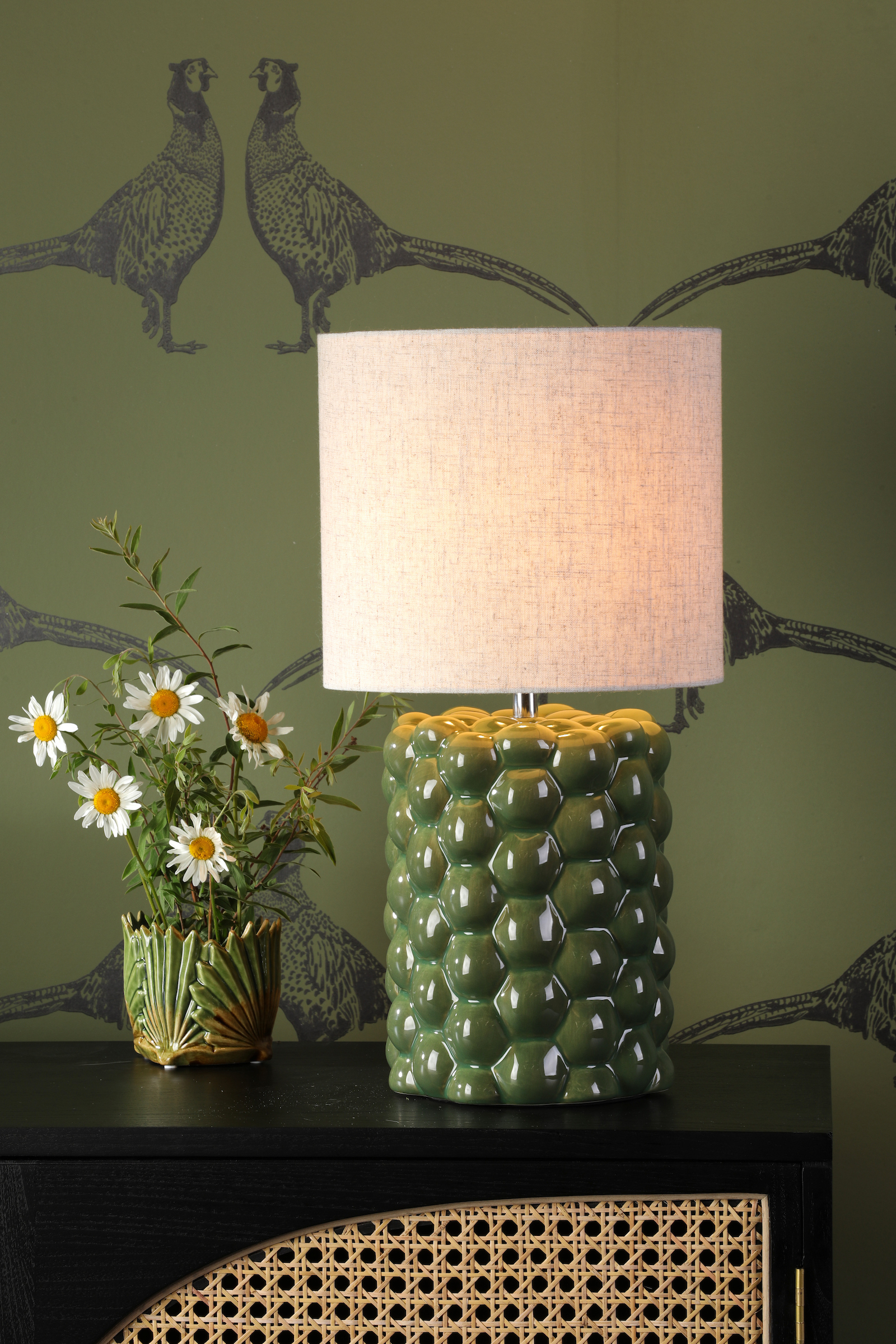 A GREEN BASE TABLE LAMP COMPLETE WITH LINEN SHADE AND IN-LINE SWITCH.