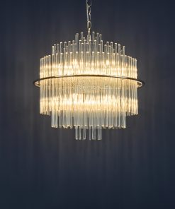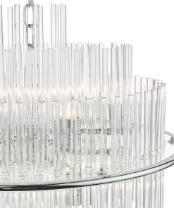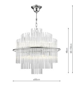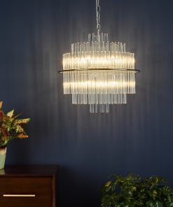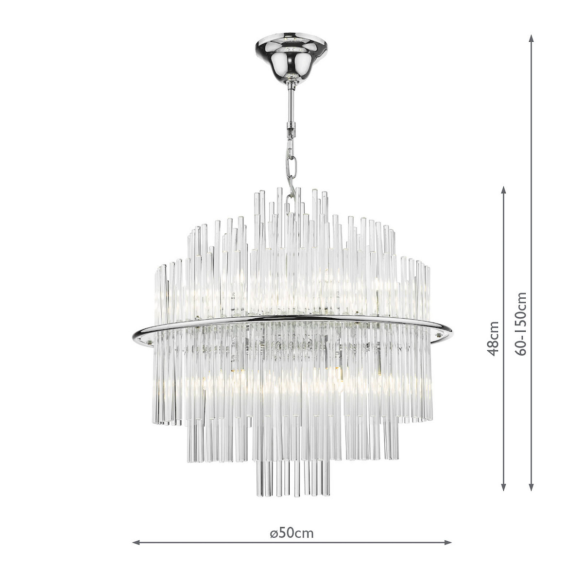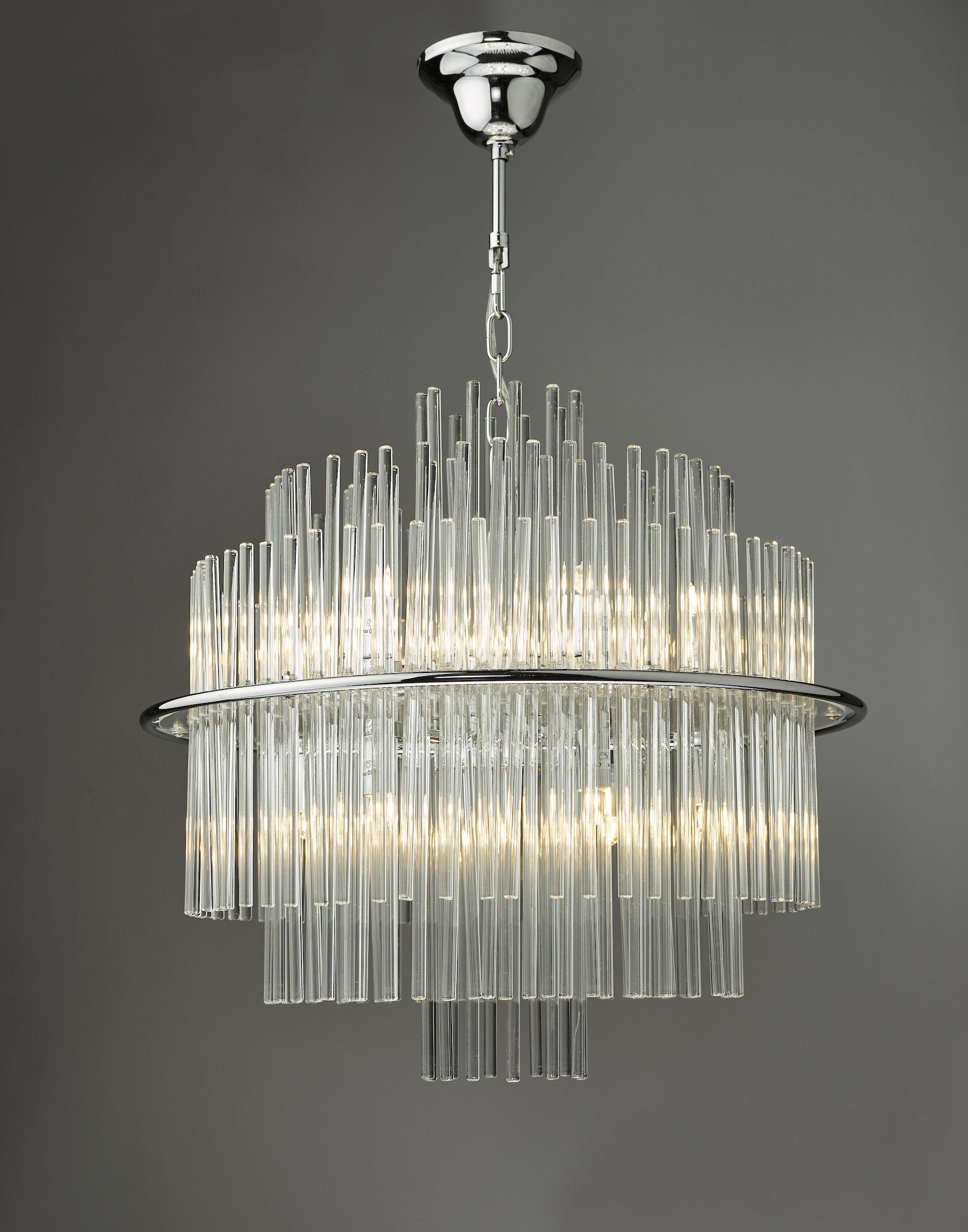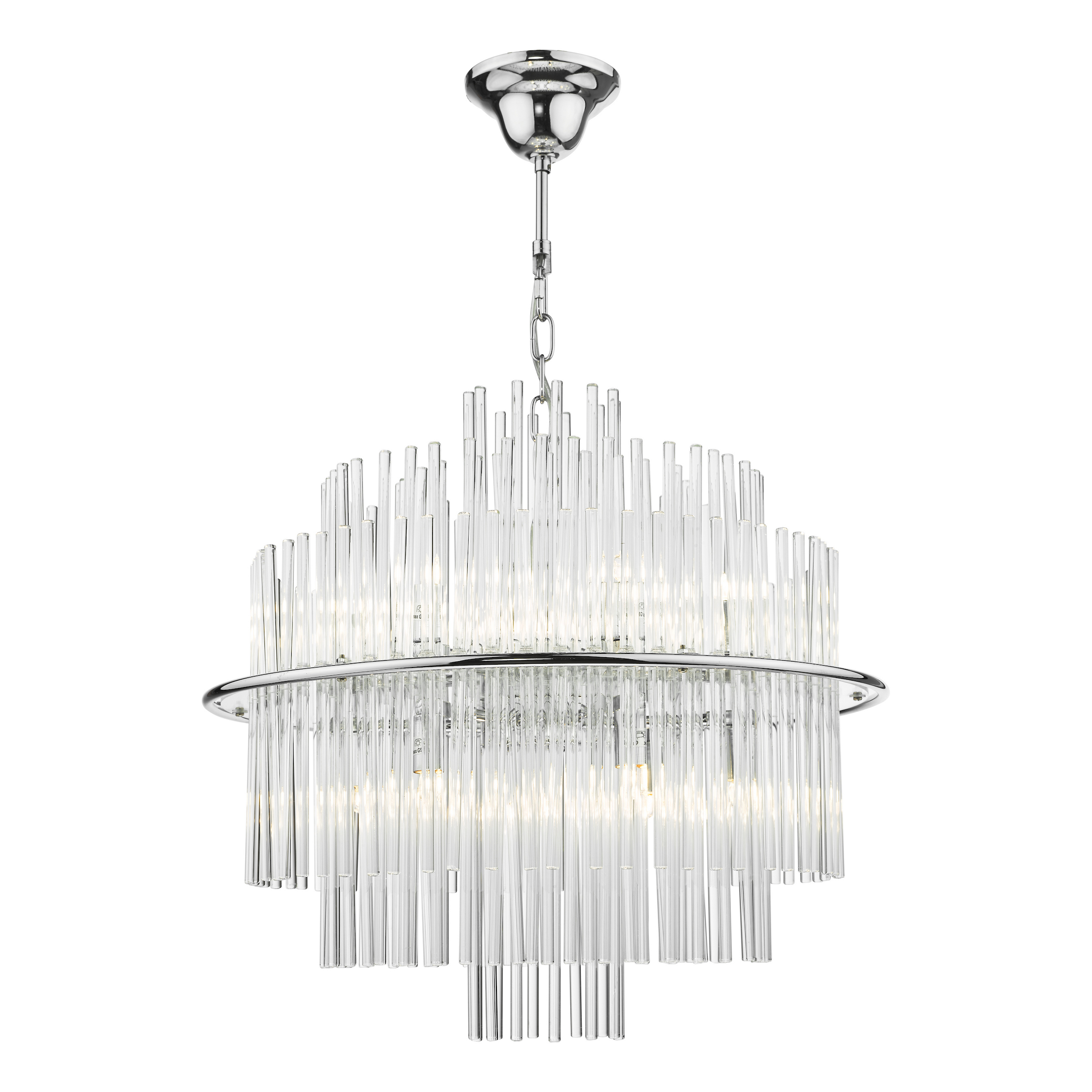 The Collins 13 light Pendant consists of hundreds of tiered glass rods appearing to give a floating illusion inside an polished chrome band. This fitting is height adjustable and would make the perfect statement piece for any living area.
